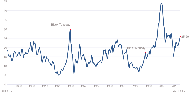 The chart below shows historical data on the Shiller P/E ratio from a great site called mutple, which updates the Shiller P/E and S&P 500 P/E daily. The Shiller P/E uses a broad measure defied as price over 10-year moving averages of earnings, so it isn’t exactly comparable to the P/E ratios for individual companies at any given time. While we aren’t at historical lows by any means we’re also nowhere near the bubble of 1999/2000.